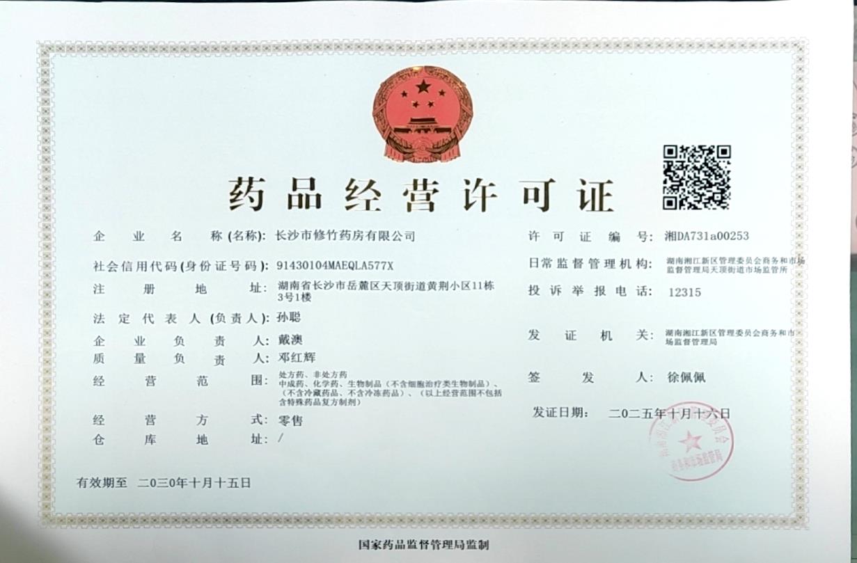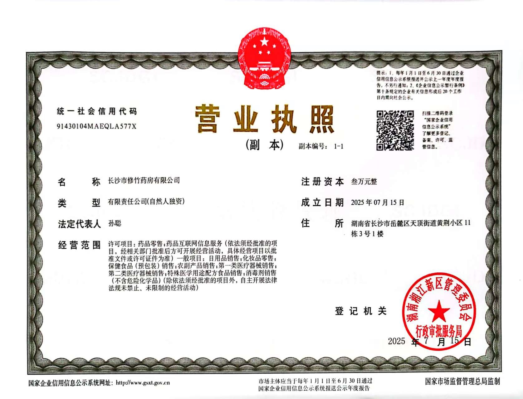 长沙市修竹药房有限公司成立于2025年07月15日,注册地位于湖南省长沙市岳麓区天顶街道黄荆小区11栋3号1楼